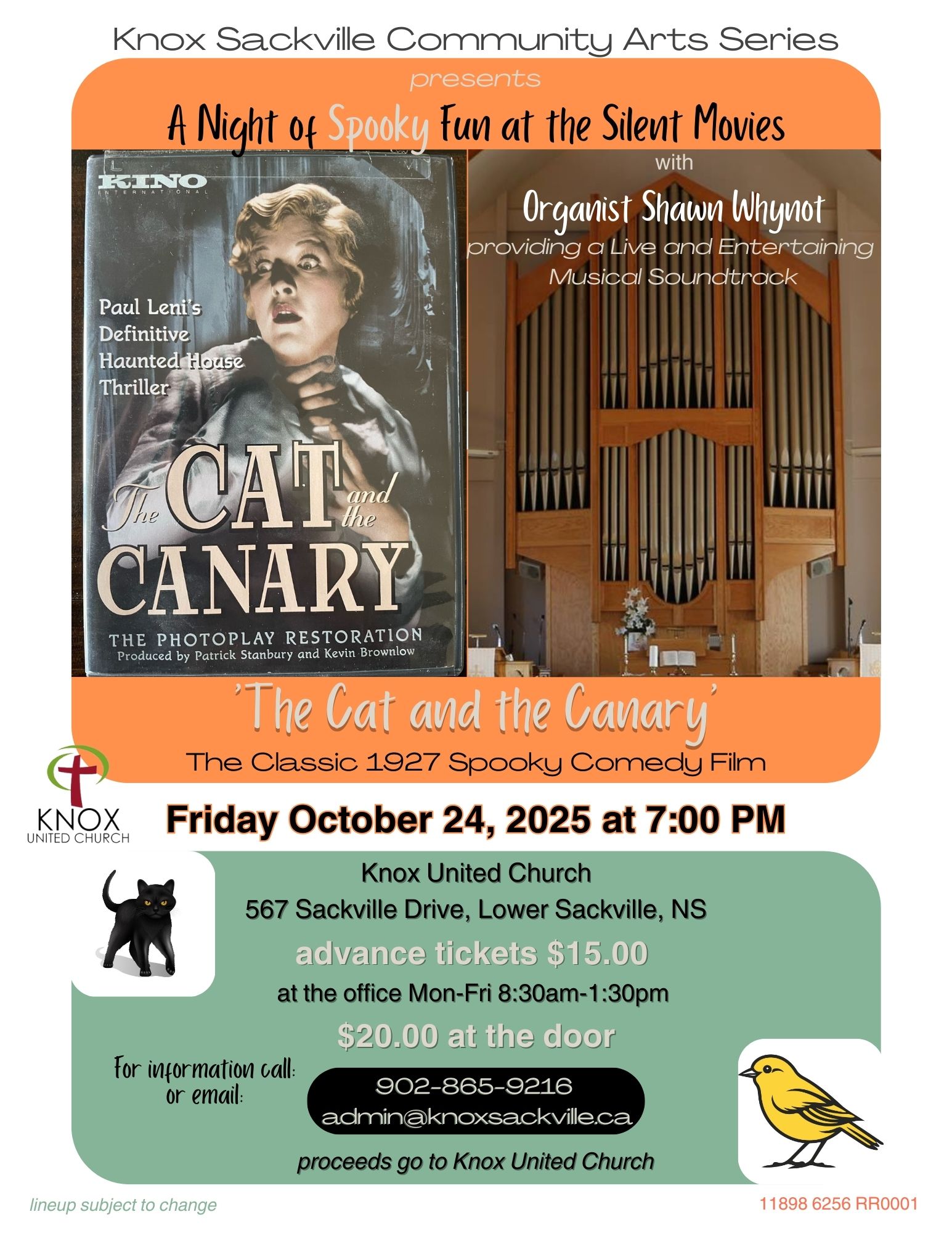 Knox United Church 567 Sackville Drive, Lower SackvilleOn Friday, October 24, at 7pm, the Knox Sackville Community Arts Series at Knox United Church in Lower Sackville (567 Sackville Drive) presents the classic 1927 spooky comedy film The Cat and the Canary, with organist Shawn Whynot providing a Live and Entertaining Musical Soundtrack “whilst the pictures are moving.” Advance tickets are $15.00 at […]